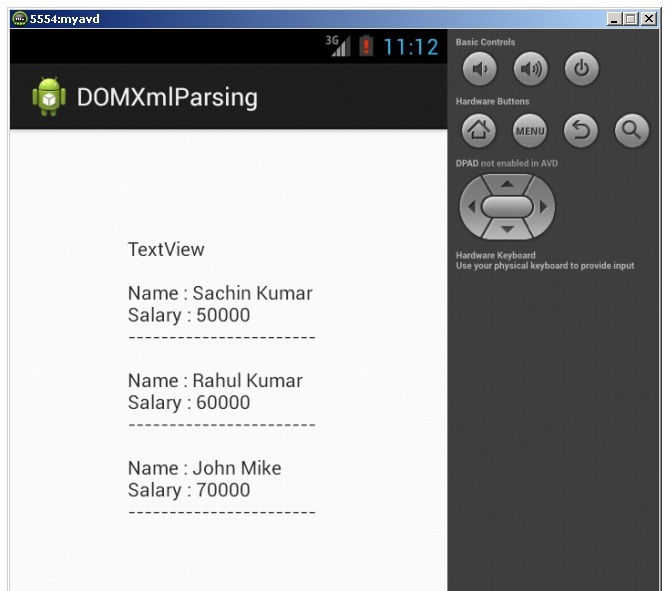 class Product { public String name; public String quantity; public String color; } public class XMLDemo extends Activity { @Override protected void onCreate(Bundle savedInstanceState) { super.onCreate(savedInstanceState); setContentView(R.layout.main); XmlPullParserFactory pullParserFactory; try { pullParserFactory = XmlPullParserFactory.newInstance(); XmlPullParser parser = pullParserFactory.newPullParser(); InputStream in_s = getApplicationContext().getAssets().open("temp.xml"); parser.setFeature(XmlPullParser.FEATURE_PROCESS_NAMESPACES, false); parser.setInput(in_s, null); parseXML(parser); } catch (XmlPullParserException e) { e.printStackTrace(); } catch (IOException e) { // TODO Auto-generated catch block e.printStackTrace(); } } private void parseXML(XmlPullParser parser) throws XmlPullParserException,IOException { ArrayList<product> products = null; int eventType = parser.getEventType(); Product currentProduct = null; while (eventType != XmlPullParser.END_DOCUMENT){ String name = null; switch (eventType){ case XmlPullParser.START_DOCUMENT: products = new ArrayList(); break; case XmlPullParser.START_TAG: name = parser.getName(); if (name == "product"){ currentProduct = new Product(); } else if (currentProduct != null){ if (name == "productname"){ currentProduct.name = parser.nextText(); } else if (name == "productcolor"){ currentProduct.color = parser.nextText(); } else if (name == "productquantity"){ currentProduct.quantity= parser.nextText(); } } break; case XmlPullParser.END_TAG: name = parser.getName(); if (name.equalsIgnoreCase("product") && currentProduct != null){ products.add(currentProduct); } } eventType = parser.next(); } printProducts(products); } private void printProducts(ArrayList</product><product> products) { String content = ""; Iterator</product><product> it = products.iterator(); while(it.hasNext()) { Product currProduct = it.next(); content = content + "nnnProduct :" + currProduct.name + "n"; content = content + "Quantity :" + currProduct.quantity + "n"; content = content + "Color :" + currProduct.color + "n"; } TextView display = (TextView)findViewById(R.id.info); display.setText(content); } @Override public boolean onCreateOptionsMenu(Menu menu) { // Inflate the menu; this adds items to the action bar if it is present. getMenuInflater().inflate(R.menu.main, menu); return true; } }